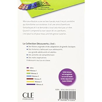 Une collection de lectures originales en couleurs pour les adolescents.Monsieur Bouton a une vie banale, mais il reçoit une lettre qui transforme son existence. Il vit une série d'aventures fantastiques et il se demande si tout cela n'est pas un rêve. Quand il comprend la vraie raison de ces aventures, c'est pour lui, et pour nous, une très grosse surprise... La Collection Découverte, c'est : Des histoires conçues pour les adolescents, par des auteurs contemporains Des activités de compréhension à la fin de chacun des chapitres de l'œuvre Des notes explicatives Des illustrations tout en couleurs Une graduation des textes proposés en 6 niveaux de difficultés plus un niveau Eveil.
